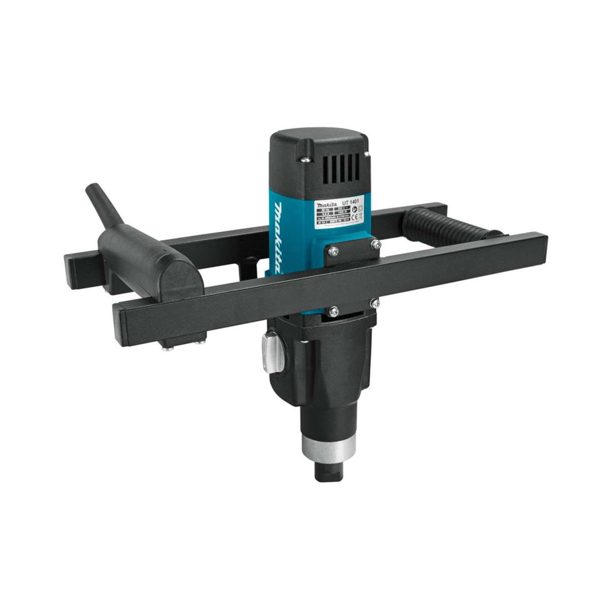 Неплохой набор опций имеет строительный миксер Makita UT1401. В приборе имеется электронная регулировка скорости вращения, блокировка кнопки включения, двухскоростной режим работы. Мощный электрический двигатель (1,4 кВт) может раскрутить шпиндель инструмента до отметки 730 об/мин. Эксперты включили эту модель за ажиотажный интерес к нему со стороны посетителей ЯМ. Только за два месяца карточку товара просмотрело около 3140 человек. При длине кабеля 3 м мастер не будет испытывать неудобств с удлинителем. Вес аппарата составляет 5,5 кг. В отзывах отечественные строители хвалят инструмент за достойное качество, удобство в работе и неприхотливость. К недостаткам можно отнести противоречивую конструкцию рукоятки (прямоугольная регулируемая), которая не всем пришлась по душе.