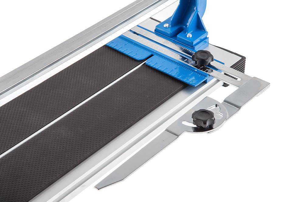 Механический монорельсовый плиткорез с двумя миллиметровыми линейками и боковыми упорами.