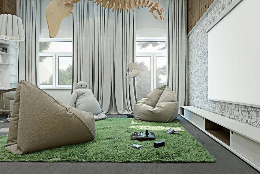 - В ограниченном по размерам помещении очень кстати придется бескаркасный диван-трансформер. В детской он тоже незаменим: без острых углов, с возможностью использования в качестве спального места, предмета детских забав.