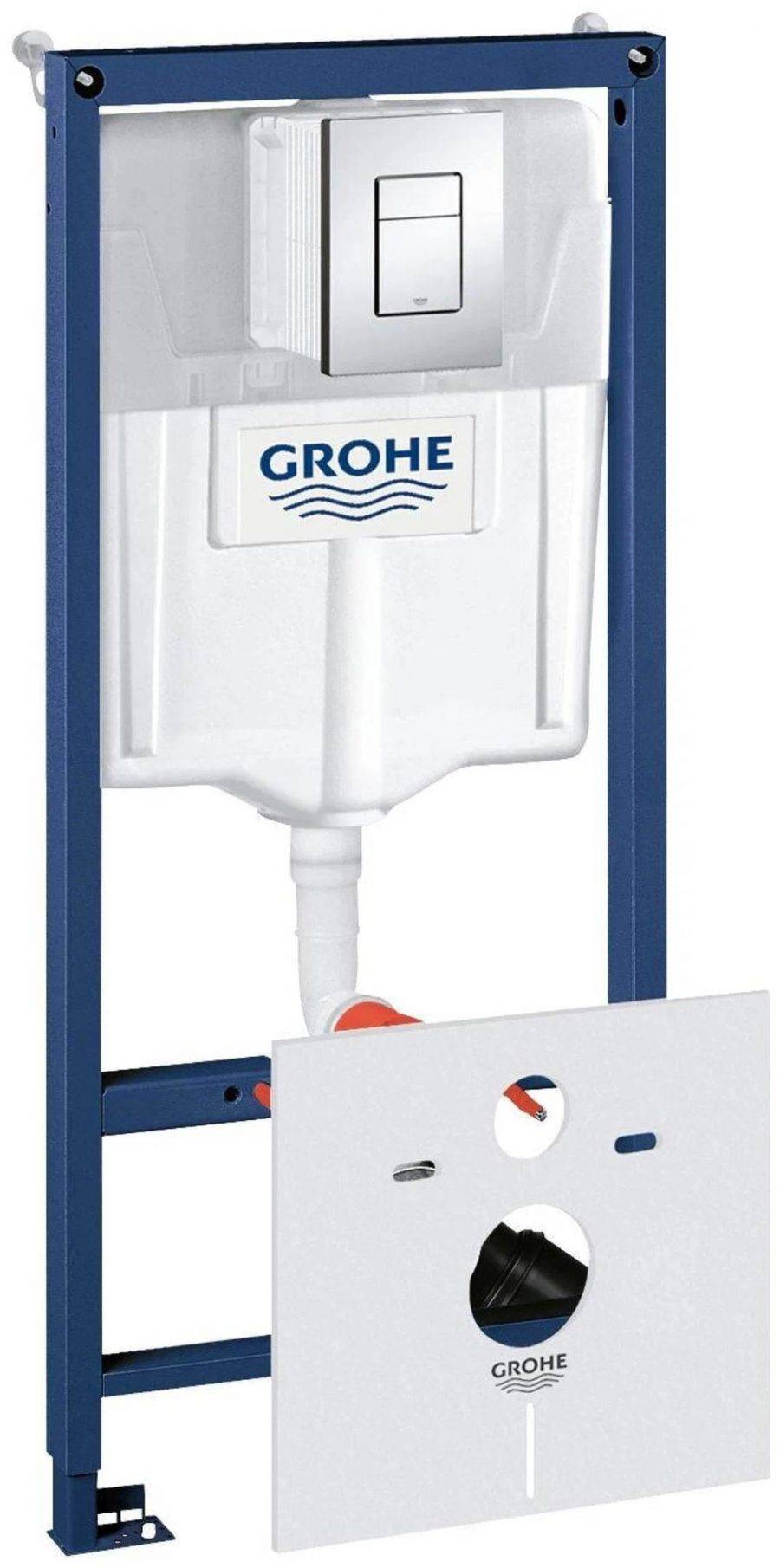Топ инсталляций для подвесного унитаза продолжает модель от Grohe Rapid. Конструкция отличается компактностью и универсальным способом подвода воды — сверху или с боку. Рама крепится в пол и капитальную стену. Пластиковый бачок объемом 9 л входит в комплект, имеет двойную квадратную хромированную кнопку и ребра жесткости. Небольшая ширина инсталляции позволяет экономить место не только в санузле, но и бережно расходовать воду. Модель имеет два варианта слива – полный и эконом. А использование технологии Grohe Ecojoy позволяет обеспечить интенсивный поток воды даже в экорежиме.