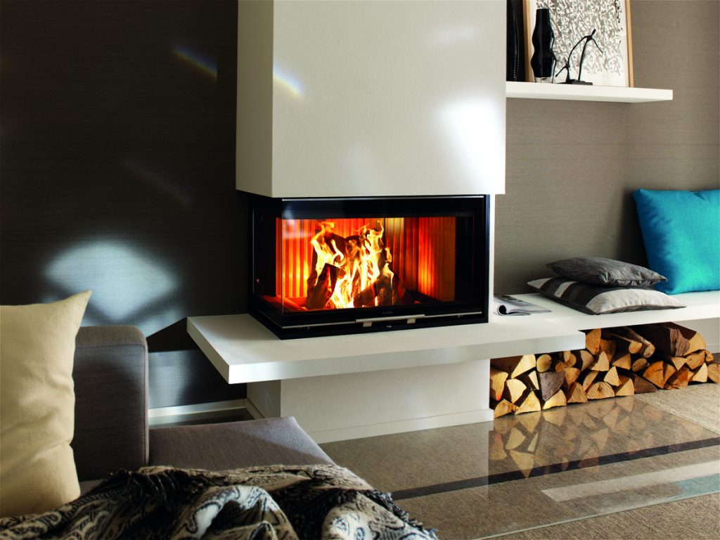 Топка для камина угловая, есть как из чугуна, так и из стали. В модельном ряду и маленькие, и компактные, и большие, шириной 569 см и высотой 1530 см. Цена — от 2500€ до 5500€.