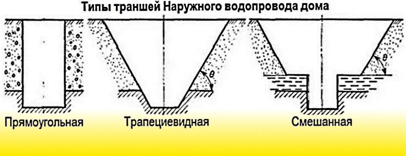 Вопрос выбора формы траншеи далеко не праздный. Он зависит от её глубины, типа грунта, уровня грунтовых вод.