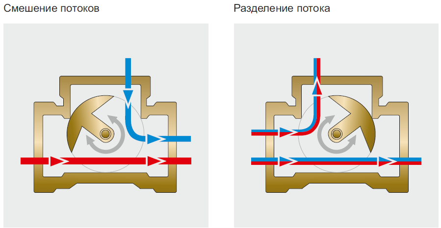 Рисунок 4. Схема работы смесительного и разделительного трехходового клапана