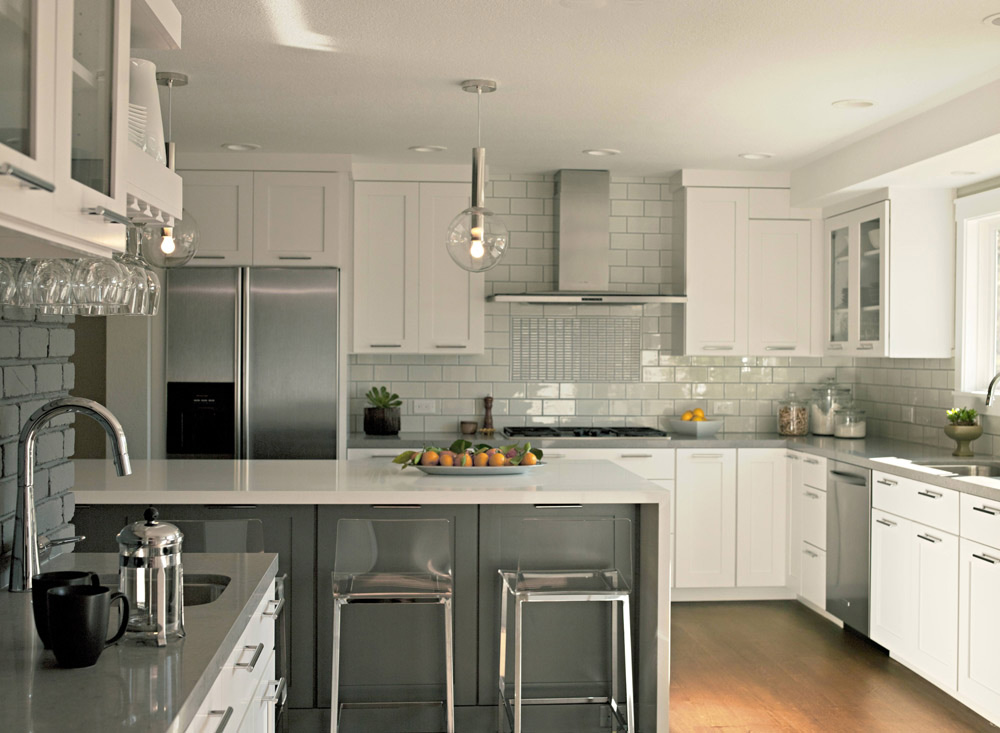Можно не бояться контрастных цветовых решений. Скажем, популярные сегодня чёрно-белые ансамбли, доставшиеся нам в наследство от ар-деко, в просторных кухнях смотрятся свежо и элегантно.