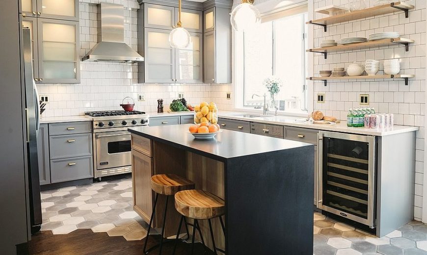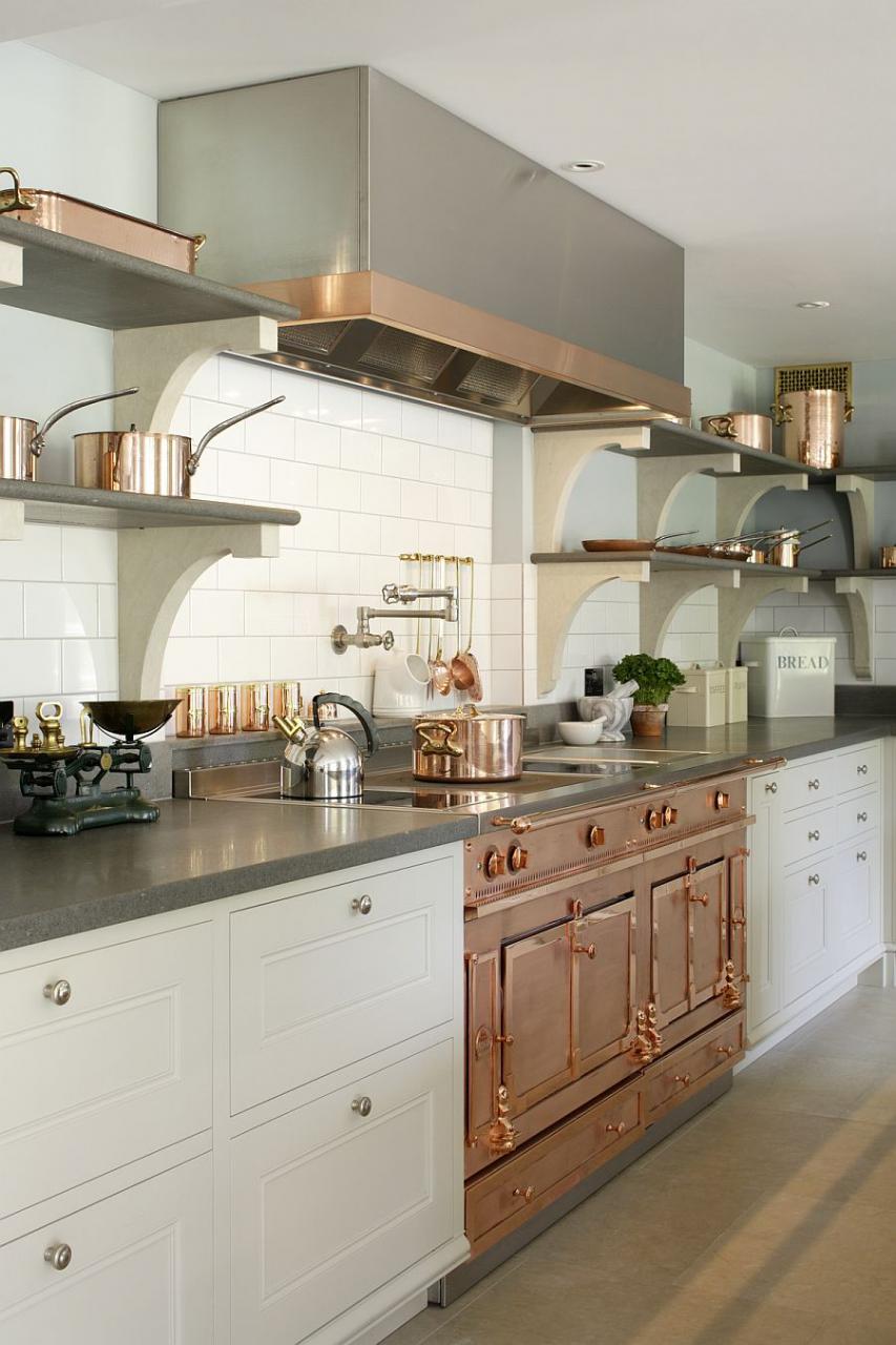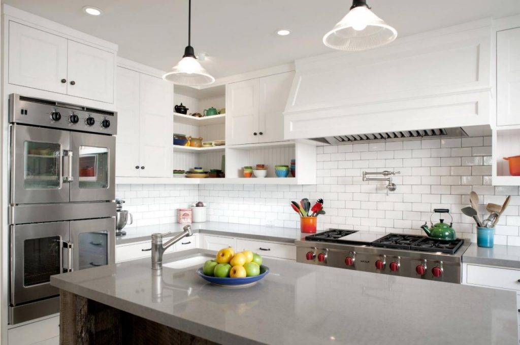 Отсутствие большого количества шкафов позволит сделать пространство менее загруженным. Они могут быть заменены полками или вытяжкой.