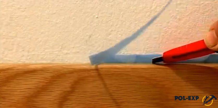 Устанавливают плинтусы, затем берут острый монтажный нож и очень осторожно обрезают выступающий край пленки, чтобы не оставить царапин на плинтусе и на стене