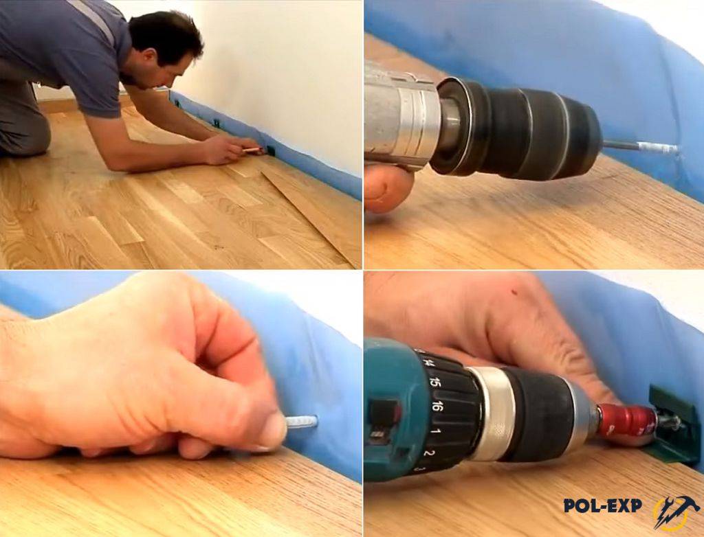 Шаг 11. Уложив покрытие, на стенах, поверх пленки, намечают места крепления кляймеров для плинтусов с шагом 40-50 см. От углов отступы не должны быть больше 20 см. Просверливают отверстия в стене сквозь пленку, вставляют дюбели и прикручивают кляймеры саморезами.