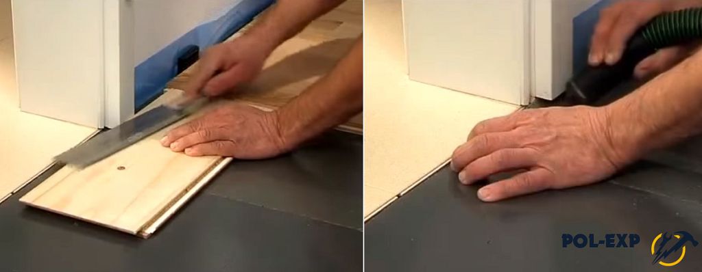Шаг 6. Дойдя до проема, отмечают на дверной коробке толщину покрытия и ножовкой аккуратно выпиливают паз под паркетную доску. Пылесосом убирают образовавшуюся пыль и стружку.
