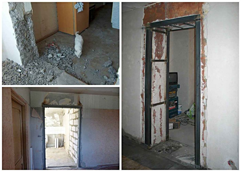 Когда проём полностью готов, необходимо проверить целостность стены по его периметру и, при необходимости, зачеканить их специальными строительными смесями и расширяющимися составами. В случае, если есть угроза обрушения лучше выполнить обрамление из уголков, стянутых полосками листовой стали.