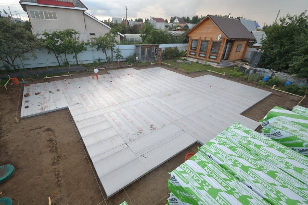 По периметру дома укладываются L-образные плиты утеплителя. Они образуют опалубку. Для защиты внешней поверхности утеплителя его закрывают плоским шифером. Верх L-образных блоков утеплителя заклеивают скотчем, от попаданий бетона.