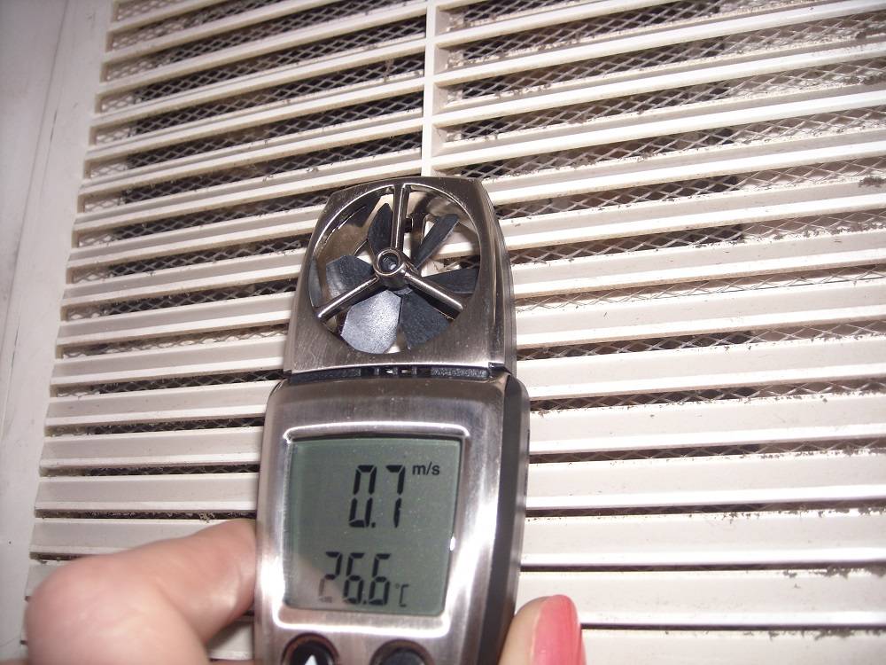 Показания анемометра – это скорость движения воздуха в вентиляционном канале. Зная ее, а также сечение решетки, можно, пользуясь специальными таблицами, просчитать производительность системы.