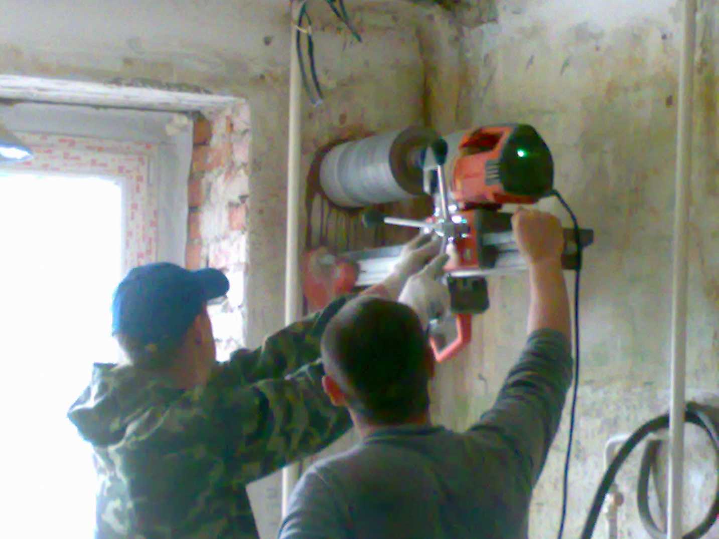 - Просверлить отверстие в стене с наклоном к наружной стороне. Для кирпичной кладки достаточно дрели, а панельная поверхность нуждается в алмазном сверлении.