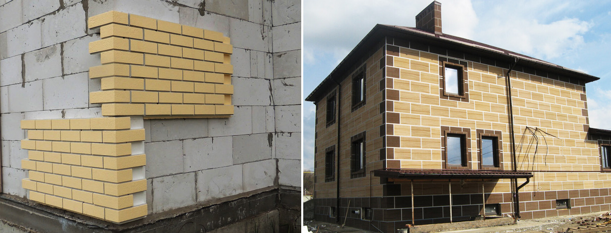 Частный дом, облицованный этим материалом, выглядит презентабельно. Дополнительно фасад декорируется искусственным камнем. Состав такой панели — пенополистирол, пенополиуретан. Перед монтажными работами стены строения тщательно выравниваются, после чего необходимо крепить сам материал. Это экологическое изделие, которое легко монтируется к кирпичной стене. Основной минус — высокая цена, особенно дорогостоящими считаются элементы для углов.