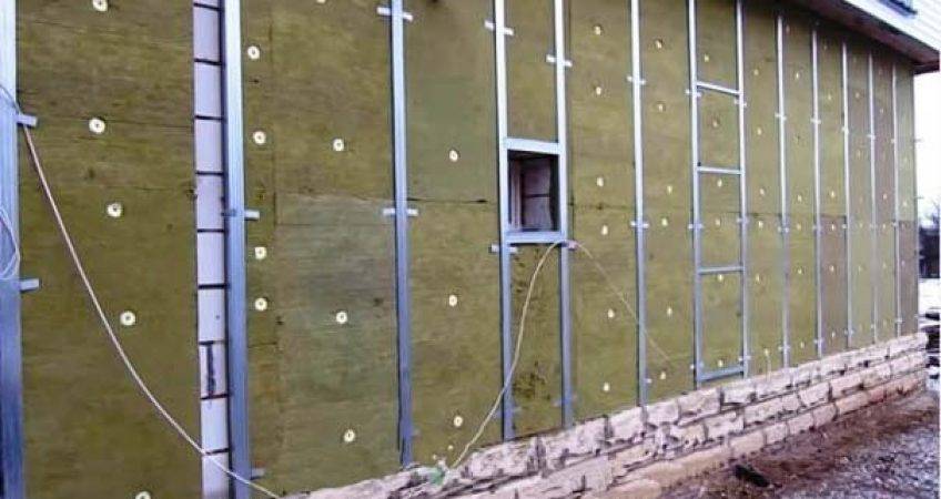 - Смонтировать вертикальную несущую обрешетку из бруска или оцинкованного профиля. Шаг установки должен быть меньше ширины утеплителя на 1-2 см.