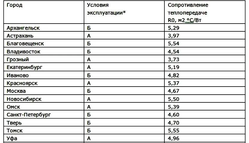 Расчет этого значения сделать непросто, поэтому существуют таблицы, в которых указаны рассчитанные показатели теплопотери для крупных городов. Например, для Москвы показатель R будет равен 4,67 м²*°С / Вт.