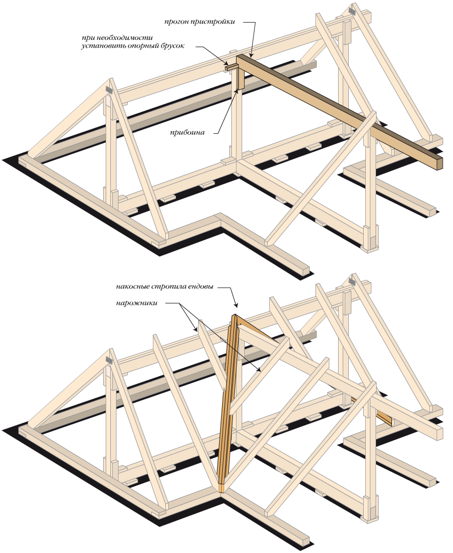 Чем больше скатов и, соответственно, их пересечений имеет крыша, тем больше усложняется стропильная система. Так, в многощипцовых конструкциях часть стропил опирается не на конек (прогон), а на балку ендовы. Такие балки называются накосными стропилами ендовы, их необходимо подгонять по месту и жестко скреплять для предотвращения перекоса конструкции в целом.