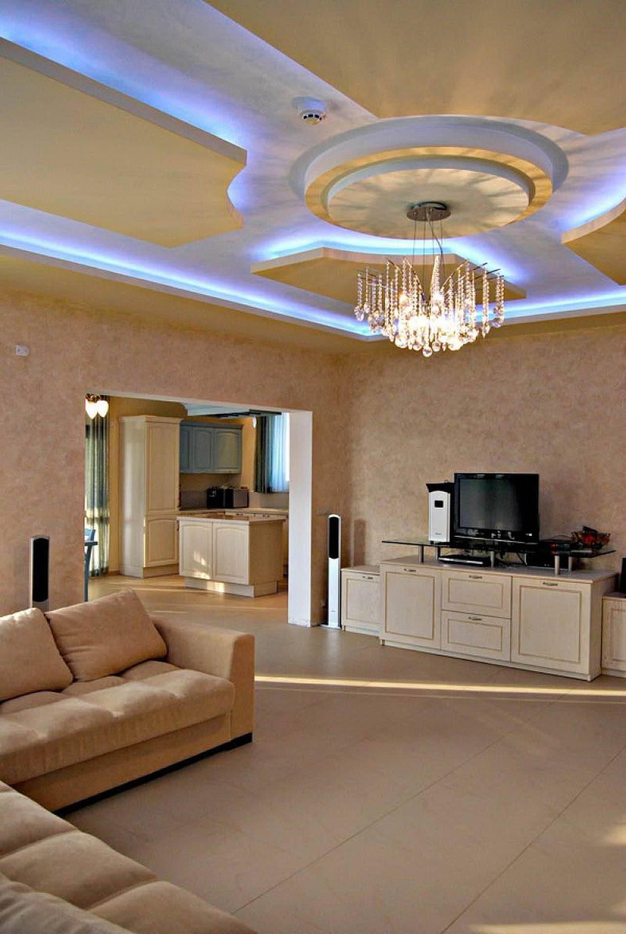 Красивый потолок из гипсокартона в зале (подвесной, двухуровневый, фигурный, с подсветкой)