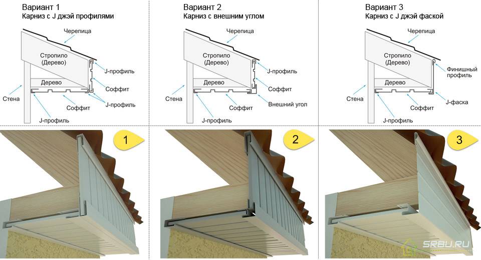 Монтаж софитов к основанию осуществляется при помощи J-образной планки. Она устанавливается вдоль карниза и вдоль стены. При этом используются саморезы. Между планками необходимо вставить листы софита.
