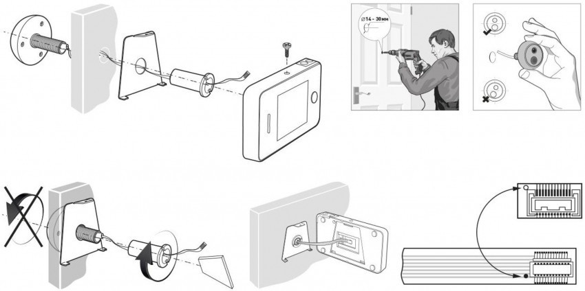 Многие задаются вопросом, как установить видеоглазок своими руками. Монтаж самодельного глазка следует выполнять в готовое отверстие, которое осталось в двери от оптического глазка. Если его в двери не было, то следует проделать отверстие с помощью электродрели.