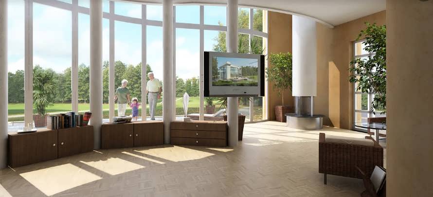 В гостиной декоративную штукатурку можно сочетать с другими видами отделки, например, обоями или панелями из дерева. Для небольшой по площади комнаты лучше выбрать состав светлого тона со светоотражающими свойствами. Изысканности гостиной добавит венецианская штукатурка с серебристым, золотистым отблеском или синим.