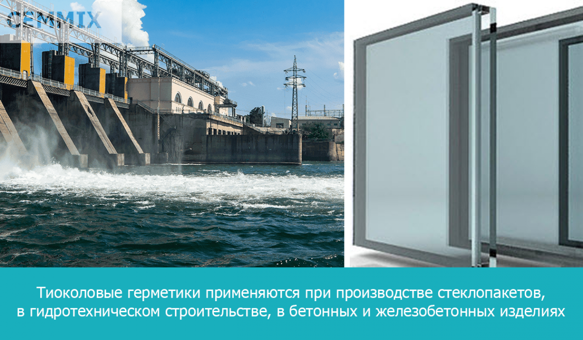 Тиоколовые герметики применяются при производстве стеклопакетов, в гидротехническом строительстве, в бетонных и железобетонных изделиях.