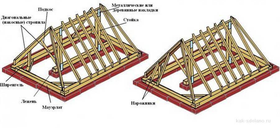 Классический каркас кроме основных стропильных ног состоит их элементов: мауэрлата, конька, накосных ног, других важных частей, которые обеспечивают прочность, участвуют в распределении нагрузки.