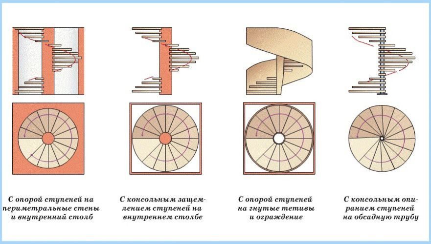 Таким образом, выделяют следующие типы конструкций винтовых лестниц: