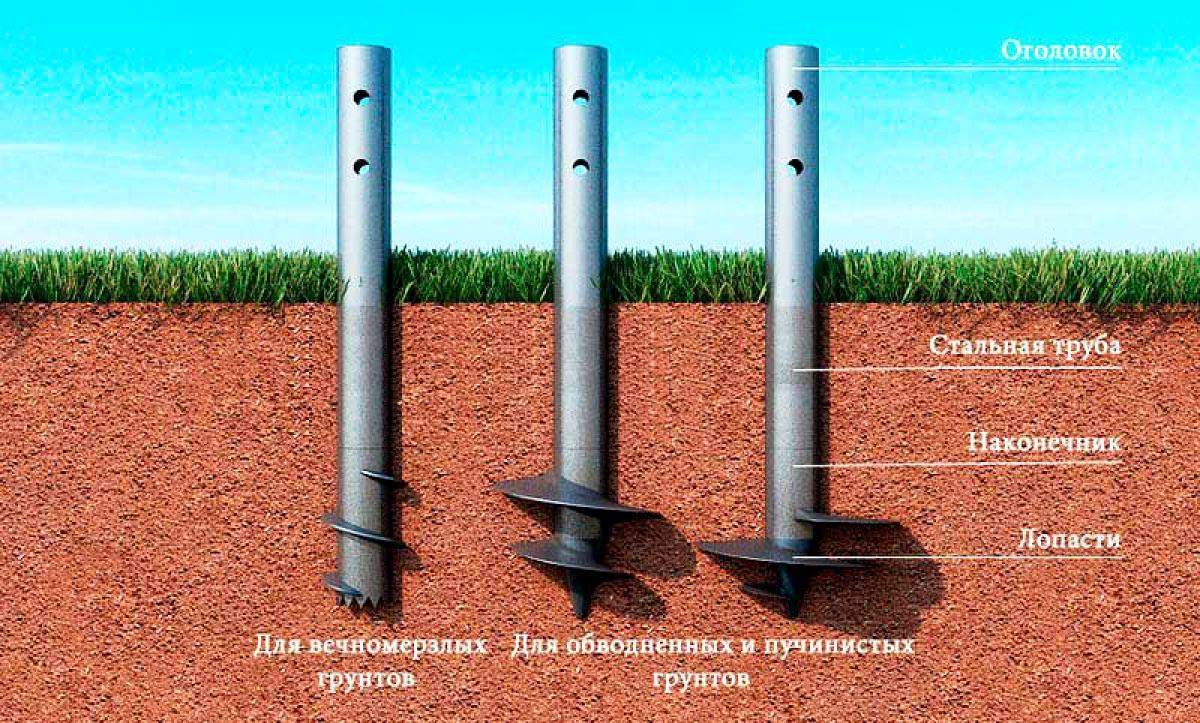 - винтовые, представляющие собой металлические трубы разного сечения с лопастями на конце, предназначенными для завинчивания в грунт;