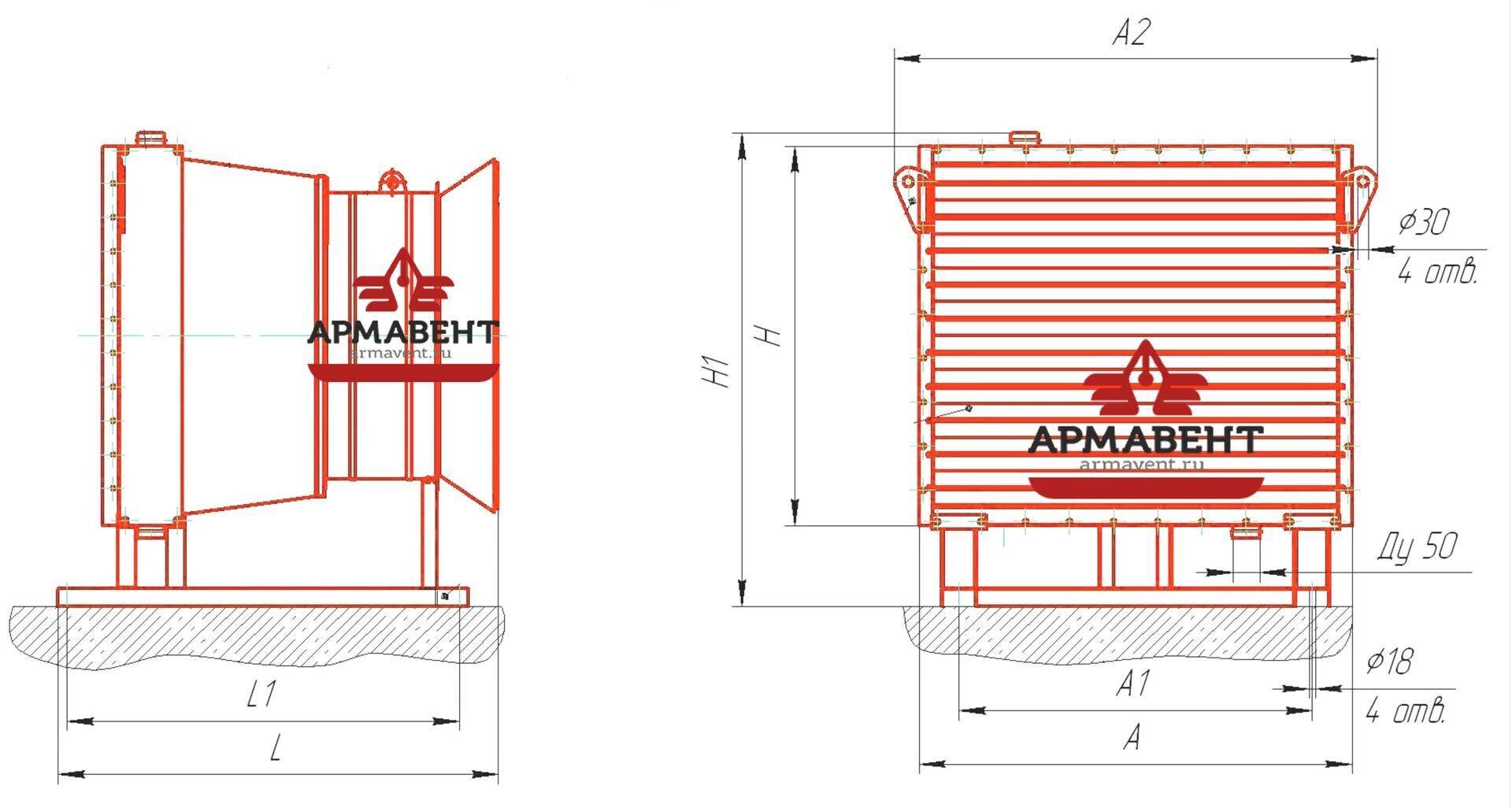 Особенность отопительных агрегатов АО состоит в их высокой производительности по теплу, достигаемой за счет оптимального расстояния между калорифером и вентилятором. Агрегат состоит из калорифера и осевого вентилятора, объединенных в единый рабочий блок. Монтаж агрегатов осуществляется установкой на раму или подвешиванием на кронштейнах. Присоединение теплообменных калориферов к трубопроводу осуществляется сваркой или фланцевым соединением. Водяные агрегаты оснащены двумя патрубками с одной боковой стороны, а паровые – по одному патрубку сверху и снизу агрегата.