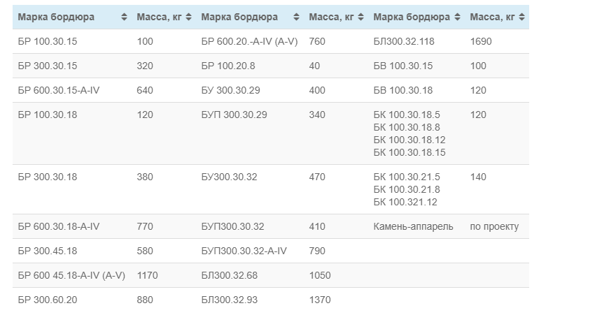 Так как изготавливаться бордюр и поребрик может из бетона с различным заполнителем, его масса может отличаться. В стандарте указана справочная масса, а точную надо смотреть у производителя.