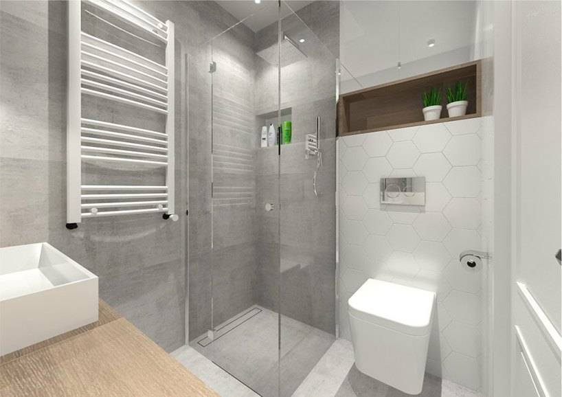 Если санузел 4 кв. м и для мытья достаточно душевой кабины, то можно разделить комнату перегородкой: в одной части обустроить туалет, а в другой — зону купания.