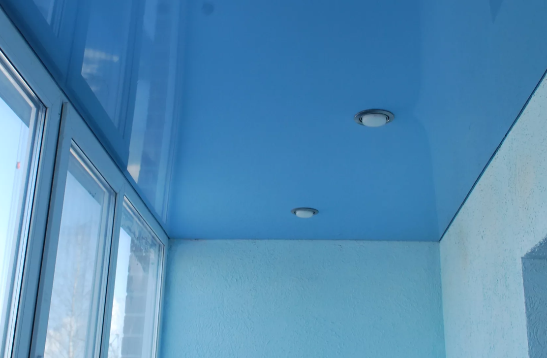 - Натяжной потолок. Если проводится капремонт и балконная часть попадает под него, можно сделать натяжные полотки. Выполнить их самостоятельную установку получится не у всех, однако поверхность будет ровной и визуально красивой. Цена не выше покраски или обшивки. Срок службы зависит от качества материала и климата региона. Подойдет для потолка с неровностями.