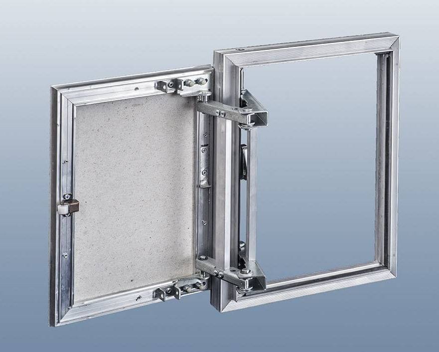 Если проем ревизионной ниши расположен на гипсокартонной перегородке или фальшстене, то стоит отдать предпочтение облегченной откидной конструкции на алюминиевой раме.
