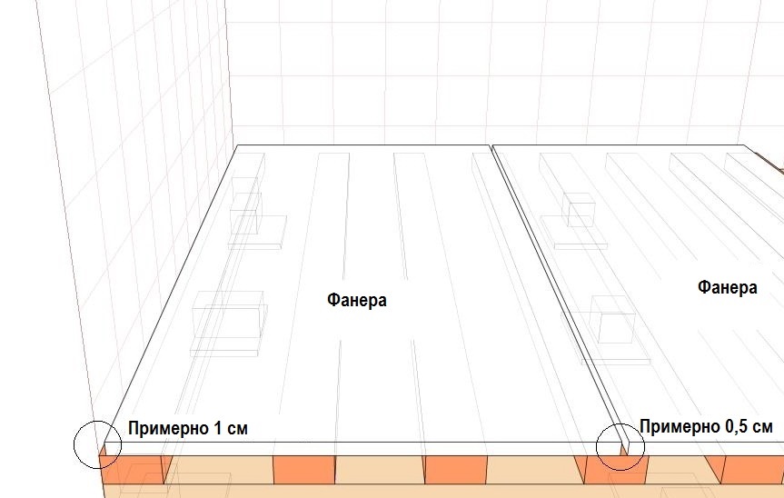 Важно! Нельзя укладывать фанеру очень плотно: оставляют зазор между фанерными листами примерно от 5 до 10 мм. А между фанерой и стеной – приблизительно от 10 до 20 мм