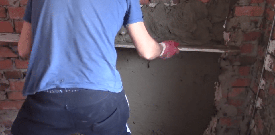 Для начала работ очищенную стену грунтуют специальным составом для максимально устойчивого сцепления штукатурной смеси с прорабатываемым участком. После высыхания этого состава начинают работу по выравниванию обрабатываемой площади с использованием строительного правила.
