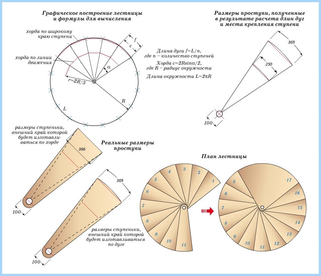 Внимание, если ступени не больше 14 сантиметров, то 2 из формулы убирается. Чтобы вычислить радиус подъема, стоит ширину лестницы разделить на 2 и добавить радиус опоры.