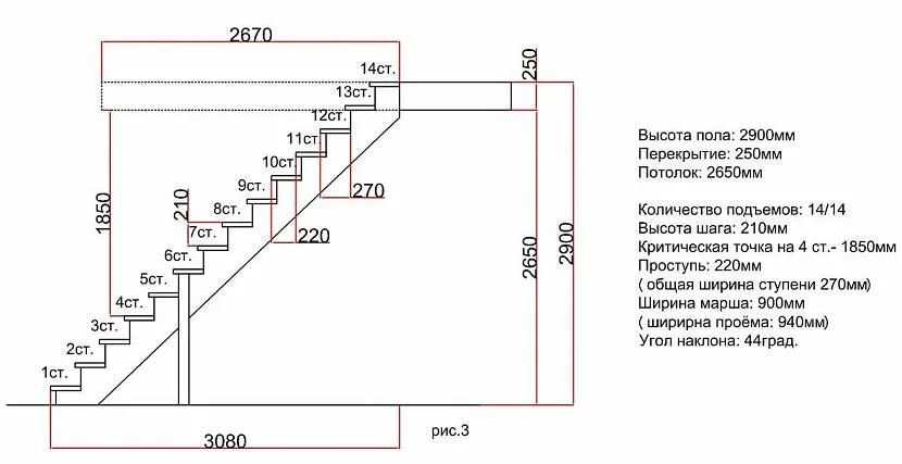 Если исходная длина марша 2,5 м и высота подступенка 15 см получим: