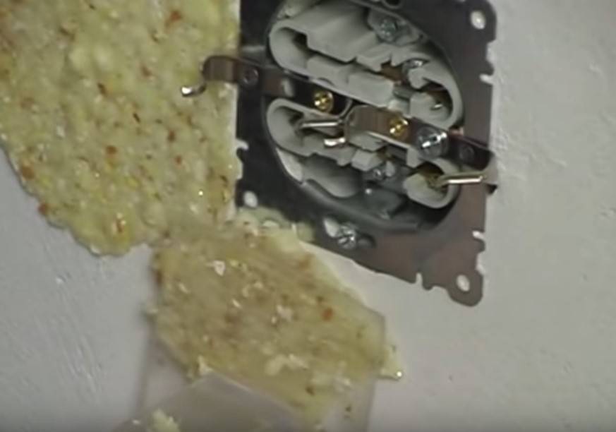 Покрытие на стену наносят движением от розетки, а не внутрь. Если кусочек массы случайно попал внутрь, его сразу убирают.
