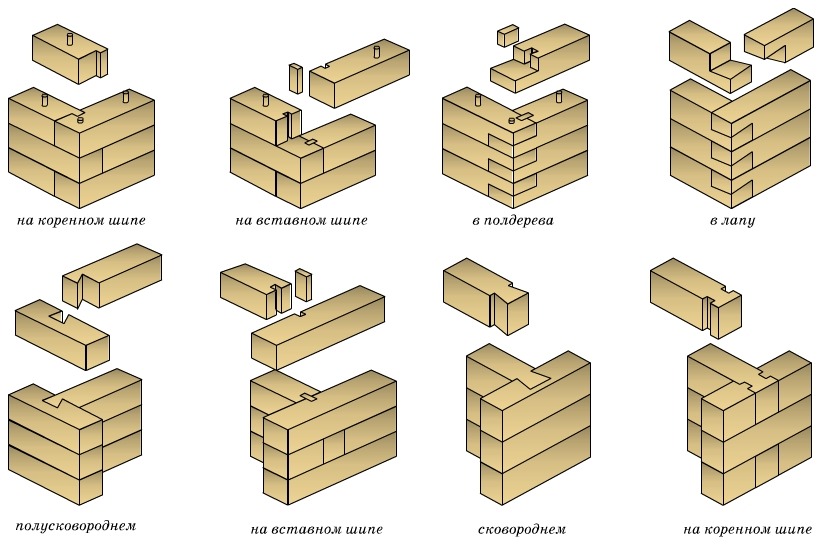 Способов соединения бруса довольно много, рассмотрим лишь некоторые из них. Углы в стенах могут сопрягаться следующими способами: